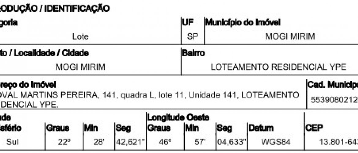 RUA NOVAL MARTINS PEREIRA,N. 141 QD L, LT 11, LOTEAMENTO RESIDENCIAL YPE - CEP: 13801-643, MOGI MIRIM - SAO PAULO nº 141